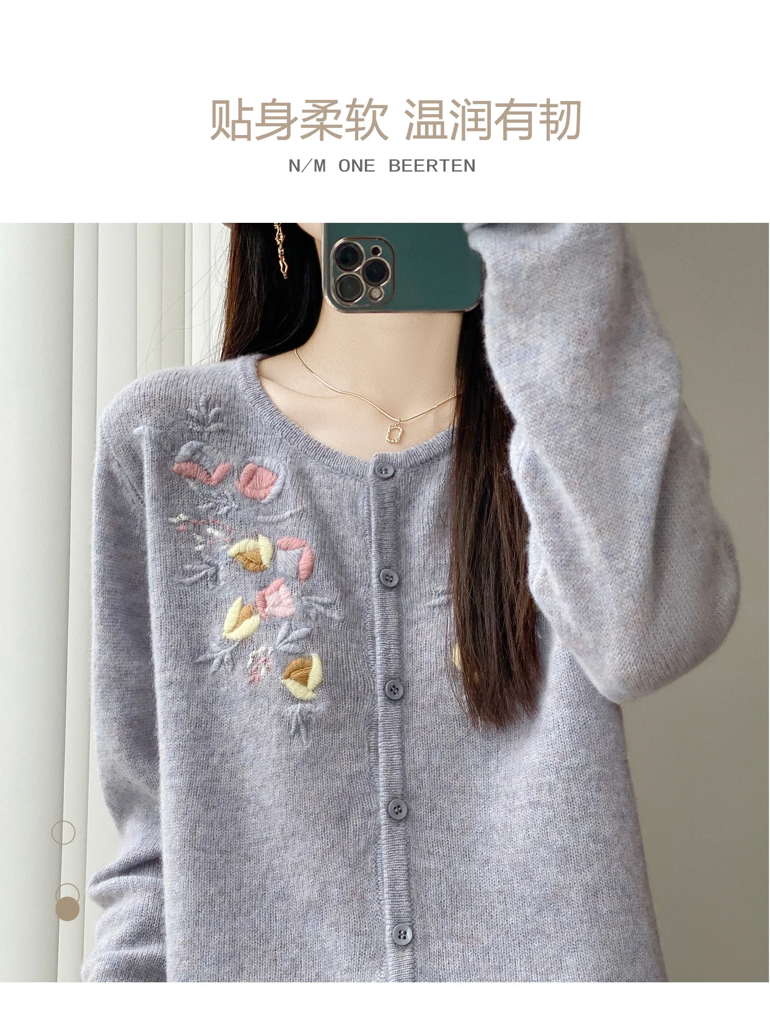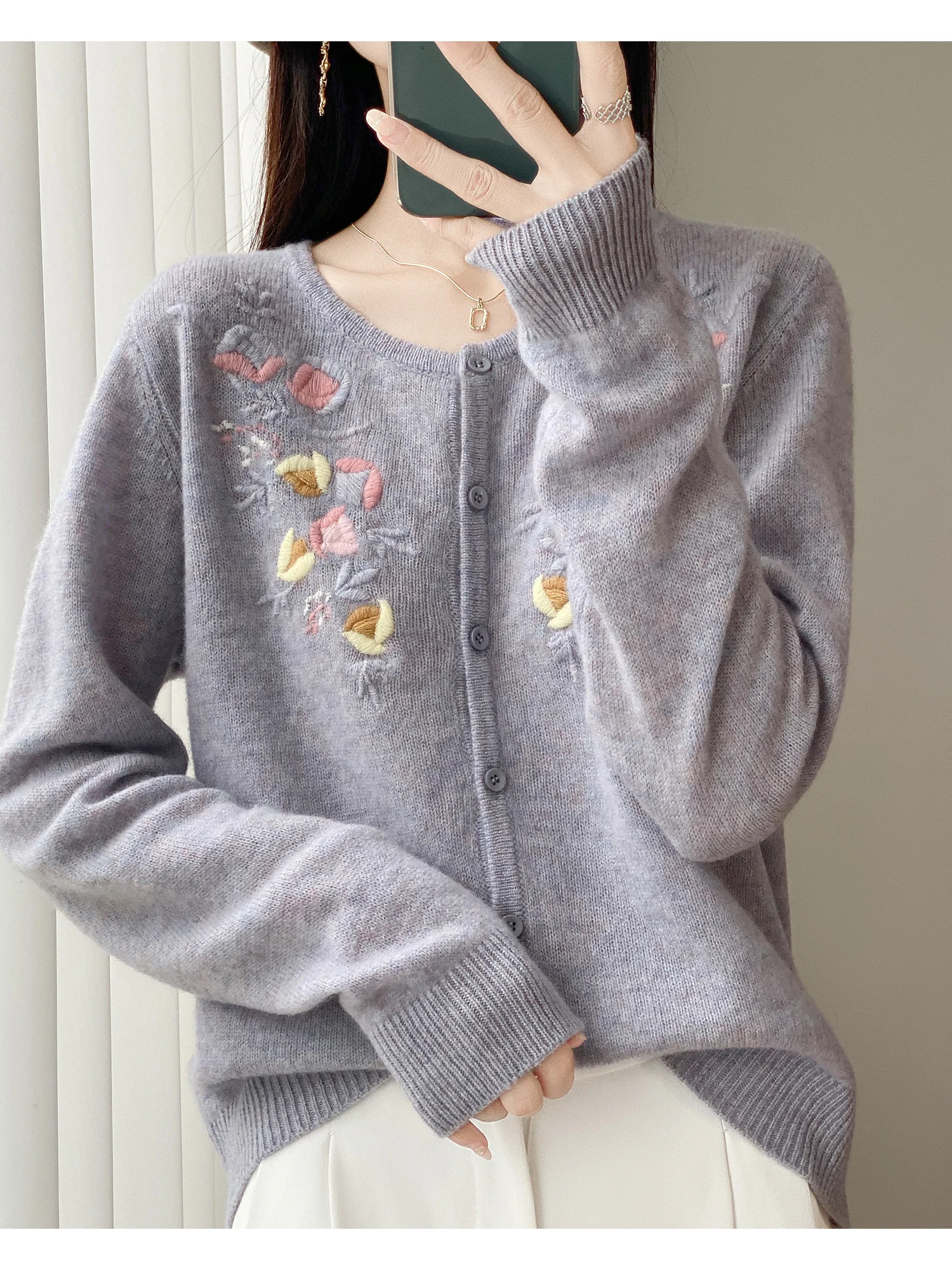 Women’s 100% Pure Wool Cardigan, Round Neck Sweater, Embroidery Knitting, Loose Fashion, Lazy Top, Autumn, Winter, New